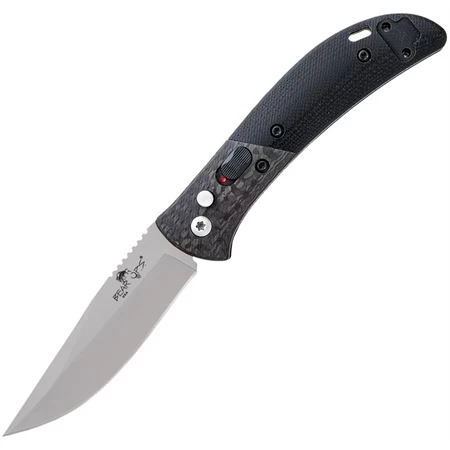 Model – BCAC900B4P. Bear & Son Auto Bold Action IX BB. Automatic opening. 3.75″ (9.53cm) closed. 2.75″ (6.99cm) bead blast finish 14C28N Sandvik stainless clip point blade. Black G10 handle with carbon fiber inlay. Lanyard hole. Pocket clip. Safety mechanism. Boxed. Proudly made here in the USA.