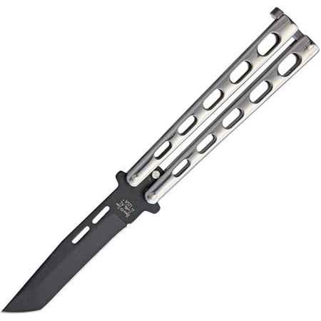 Model – BCSS15TAN. Bear & Son SS15TAN – Butterfly Black Powder Coated Tanto Blade Knife with Mirror Finish Stainless Handle. Butterfly. 5″ closed. 3.38″ black powder coated 1095HC steel tanto blade. Mirror finish 440 stainless handle. Boxed. Proudly made in the USA.