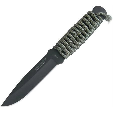 Model – BF726. Black Fox 726 – Throwing Knife. 9″ (22.86cm) overall. 4.25″ (10.8cm) black titanium coated 440 stainless blade. Green paracord wrapped handle. Full tang. Black nylon belt sheath. Boxed. Made in China.