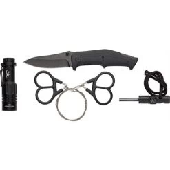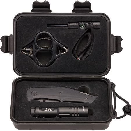 Model – BR0288. Browning 0288 – Outdoorsman Survival Combo with Black G10 Handle. Assisted opening. 4.5″ closed. 3.5″ stonewash finish stainless drop point blade. Black G10 handle. Pocket clip. Wire saw with figure 8 wire pull rings. Combination compass, fire starter, and survival whistle. Flashlight with spot to flood beam and push button switch. 50 lumens on high and 10 lumens on low. Uses one AA battery (not included). Black waterproof polymer case with O-ring seal. Clam packed. Made in China.