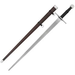 Model – PC2106. Practical Hand-and-a-Half. 41.75 inch overall. 34.25 inch blunt tip steel blade. Black leather wrapped handle. Steel guard and pommel. Brown wood scabbard.