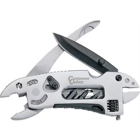 Model – CC0020. Ranch Hand Multi-Tool. 4.75 inch overall. Cast stainless construction. Tools include pliers, crescent wrench, 2.25 inch blade, Phillips and flat screwdrivers, and star bit. Pocket clip. Made in China.