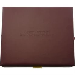 Model – H1904. Collectible Coin Display. Brown faux leather box measures 11 inch x 9.5 inch x 2 inch. Locking brass clasp with key. Formed inserts hold 28 coins. Boxed.