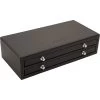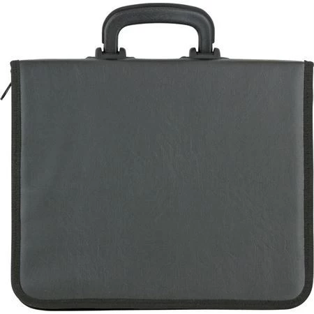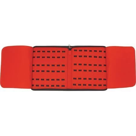 Model – CN210781. Knife Storage Case. Black leatherette construction with red felt lined interior. Zippered. Black composite carrying handle. Black elastic bands. Will hold 40 folding knives. Bulk packed.