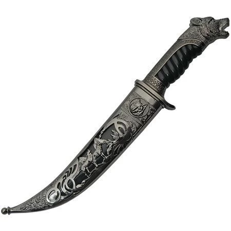 Model – CN211471WSL. China Made 211471WSL – Wolf Pack Dagger. 13.75″ overall. 7.38″ satin finish stainless blade. Black synthetic and pewter handle with wolf shaped pommel. Black synthetic and pewter scabbard. Boxed. Made in China.