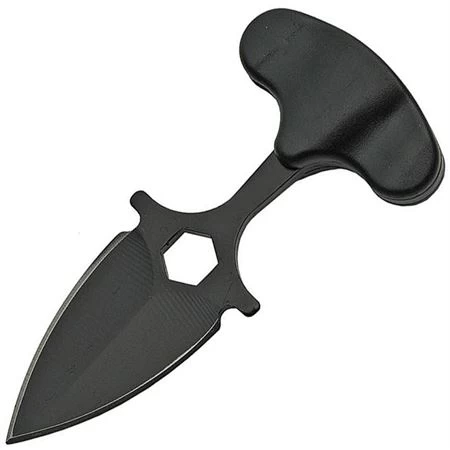 Model – CN211502. China Made 211502 – Skull Push Dagger. 3.25″ (8.26cm) overall. 1.5″ (3.81cm) black finish double edge stainless dagger blade. Black synthetic handle. Ball chain lanyard. Black synthetic neck sheath with skull inay. Boxed. Made in China.