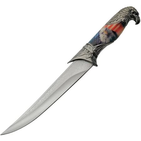 Model – CN211533. China Made 211533 – Eagle Bowie. 13.5″ (34.29cm) overall. 8″ (20.32cm) 420 stainless blade. Silver finish plastic handle. Blade etching. Eagle artwork on handle and scabbard. Plastic scabbard. Made in China.