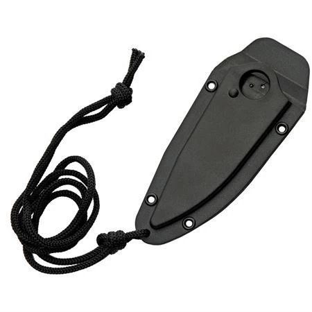 Model – CN211550. China Made Tactical Neck Knife. 5.5″ (13.97cm) overall. 3.25″ (8.26cm) black finish stainless blade. Black G10 handle. Full, extended tang. Lanyard hole. Metal belt clip. Cord lanyard. Black molded plastic belt sheath. Boxed. Made in China.