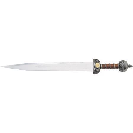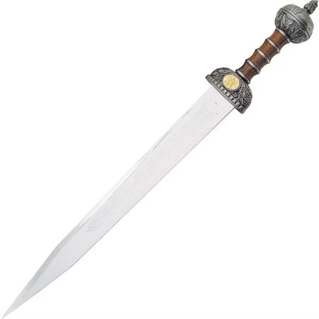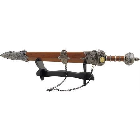 Model – CN926625. China Made 926625 – Roman Gladius Sword Fixed Stainless Blade with Metal Handle. 30 1/8″ overall. 22 1/8″ mirror polished unsharpened stainless blade. Simulated wood finish cast metal handle with antique silver finish sculpted cast metal guard and pommel. Matching scabbard. Wooden tabletop display stand. Made in China.