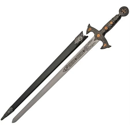 Model – CN926928. Knights Templar Sword. 29.5 inch overall. 22.5 inch mirror finish unsharpened stainless blade. Silver and rose gold sculpted metal alloy handle, guard, and pommel. Blade etching. Black leather wrapped scabbard. Boxed.