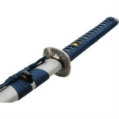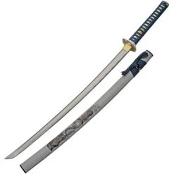 Model/Part Number – CN926985. China Made Water Dragon Katana. 41″ (104.14cm) overall. 30″ (76.2cm) 1045 carbon steel blade. Blue cord wrapped handle. Water dragon print PVC scabbard. Boxed. Made in China.