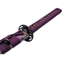 Model/Part Number – CN926995. China Made Growling Dragon Katana. 41″ (104.14cm) overall. 30″ (76.2cm) 1045 carbon steel blade. Purple cord wrapped handle. Dragon and flame print PVC scabbard. Boxed. Made in China.