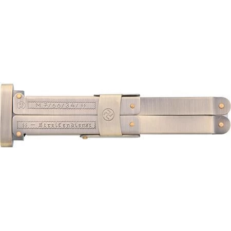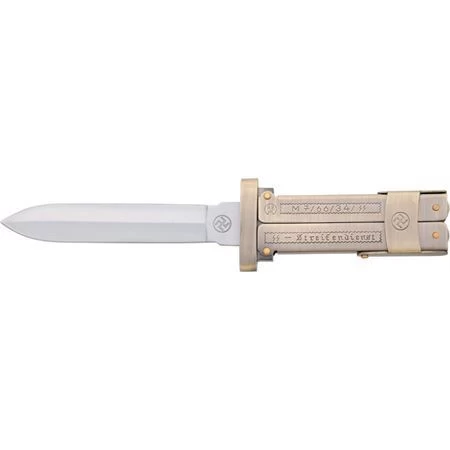 Model – MI092. China Made MI092 – Paratrooper Dagger Fixed Blade Knife with Brass Finish Aluminum Handle. 5 7/8″ closed. 4 1/4″ stainless double edge dagger blade enclosed by handle when not in use. Brass finish aluminum handle. Made in China.