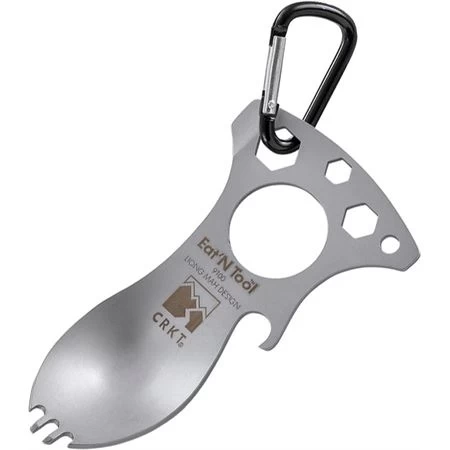 Model – CR9100C. iD Works EatN Tool. 4 inch overall. Features spoon, fork, bottle opener, screwdriver/pry bar, metric wrenches. Carabiner clip. Bead blast finish. Stainless construction. Hang packaged.