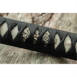 - White rayskin handles with black cord wrap and silver finish snowflake menuki fitted beneath the cord wrap