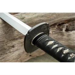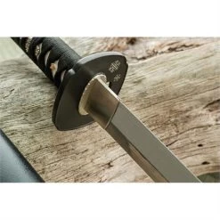 Model – DRK35220. Winter Sun Katana Sword with high Carbon Forged Steel Blade. 44.5 inch overall. 31.5 inch through-tempered 5160 high carbon forged steel blade. Relief cast blackened finish tsuba with two snowflakes on one side and a pair of Japanese Macaque Snow Monkeys on the other side. White rayskin handles with black cord wrap and silver finish snowflake menuki fitted beneath the cord wrap. Black lacquer finish wood scabbard with black cord wrap trim. Black cloth storage sleeve. Made in China.