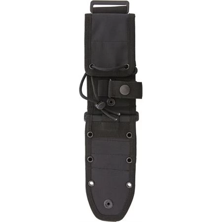 Model – ES52MB. MOLLE Back Black. Fits Esee Models 5, 6 and Laser Strike sheaths. The top of the MOLLE back has both an adjustable handle retention strap and a flap that can be slipped over the pommel of the knife and secured tight with the paracord and cord lock thus making the sheath jump safe. Both the top and lower portions of the MOLLE back have built-in belt loops and MOLLE straps. Black nylon sheath. Bulk packed.