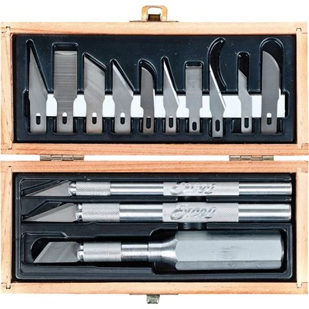 Model – EXB44283. Craftsman Set. Includes: K1 light duty knife; K2 medium duty knife; K6 heavy duty knife; and 10 assorted blades. Assorted blades include: (2) #11 and one each #16, 19, 02, 17, 22, 10, 18, 24. Wooden gift box.