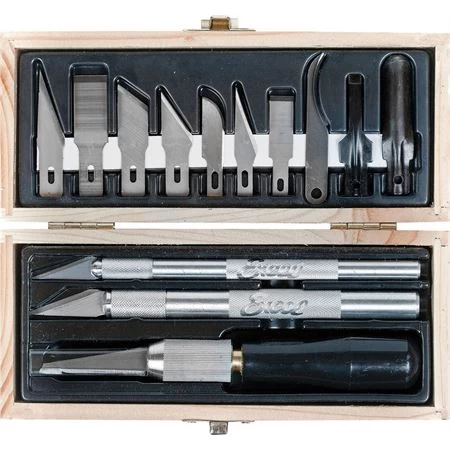 - Includes: K1 light duty knife, K2 medium duty knife, K7 woodcarving knife, and 10 assorted blades and gouges