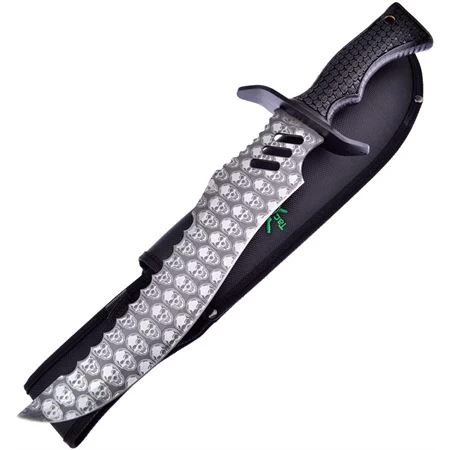 Model/Part Number – FTA065BE. Frost Cutlery & Knives Skull Bowie. Tac Assault. 17″ (43.18cm) overall. 11.5″ (29.21cm) sawback stainless blade. Black sculpted rubber handle. Stainless guard. Blade etching. Skull relief handle artwork. Black nylon belt sheath. Boxed. Made in China.