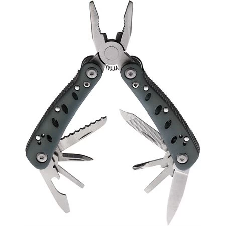 Model/Part Number – GAG2019S. Ganzo Knives Multi Tool. 3″ closed. Gray aluminum handles. Tools include: Bottle opener l Can opener l Pliers l File l Awl l Wire stripper l Small blade l Phillips screwdriver l Flat head screwdriver. Black nylon belt sheath. Boxed. Made in China.