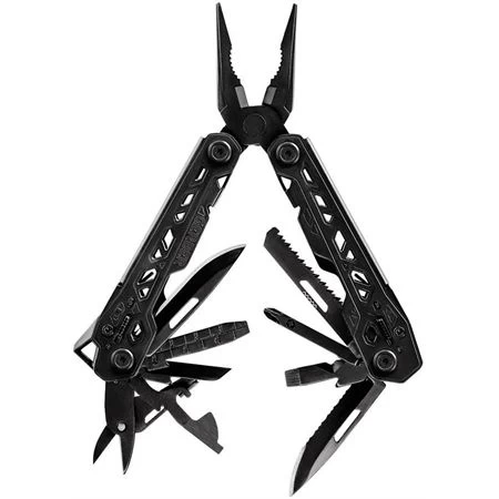 Model – G1779. Truss Multi Tool Black. 6.5 inch overall. Tools include: Needlenose pliers l Pliers l Wire cutter l Small blade l Serrated blade l Scissors l Saw blade l Small screwdriver l Flat head screwdriver l Large screwdriver l Can opener l Bottle opener l Awl l File l Ruler l Wire stripper. Real cross driver. Black nylon belt sheath. Boxed with hanging tab.