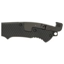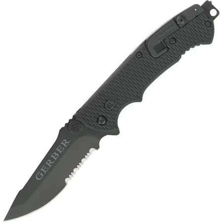 Model – G1870. Gerber 1870 – Hinderer CLS Part Serrated Clip Point Linerlock Folding Pocket Knife. (Combat Life Saver). 5 1/8″ closed linerlock. Black finish 440A stainless partially serrated clip point blade with oversized dual thumb studs. Textured black glass filled nylon handles with integrated glass breaker, seat belt cutter and oxygen tank valve opener. Made in Taiwan.