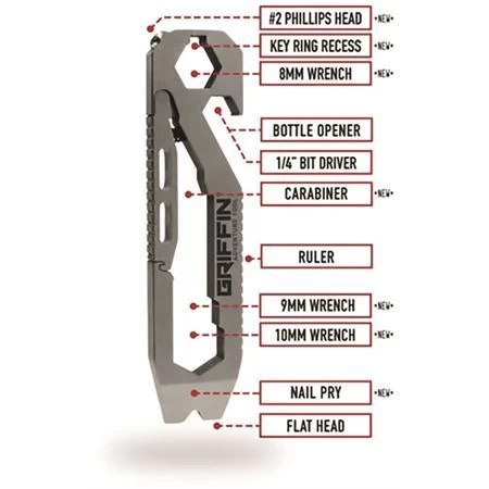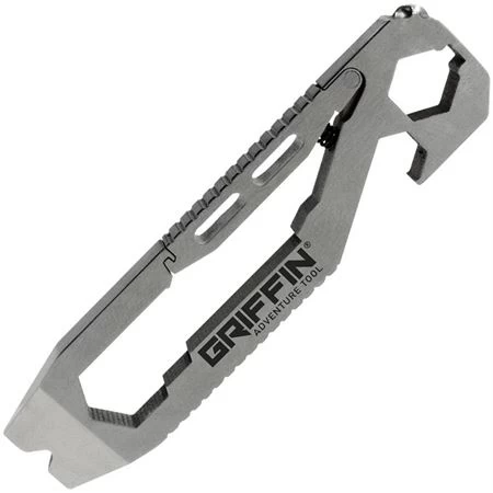 Model – GPTGATSS. Griffin Adventure Tool. 3 inch overall. Stainless construction. Tools include: Bottle opener l Pocket clip l Carabiner l Phillips screwdriver l Flat head screwdriver l Pry bar l Hex/Bit driver l Ruler I Scoring tool I Hex wrench (8mm, 9mm, 10mm). Clam packed.