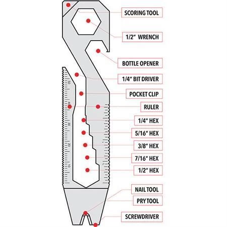 - Construction: Stainless; Overall: 4.25″; Additional Tools: Wrench l Bottle Opener l Ruler l Nail File l Small Screwdriver; Other Info: Scoring tool;.25″ bit driver; pocket clip; Hex driver (1/4″; 5/16″;.38″; 7/16″;.5″); and pry tool