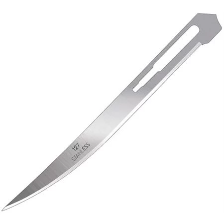 Model – HV127XT5. Baracuta Quik-Change Blades. 5 inch stainless replacement blades fit all Baracuta knives. Snap on and off the handle. Individually wrapped. Contains five blades. Hang packaged.