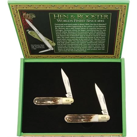 Model – HRFS6. Father/Son Stag Bone Set. Mirror finish stainless clip blade. Stag bone handle. Nickel silver bolster(s). Inlay shield. 2.88 inch closed Father barlow and 2.38 inch closed Son barlow. Gift boxed.