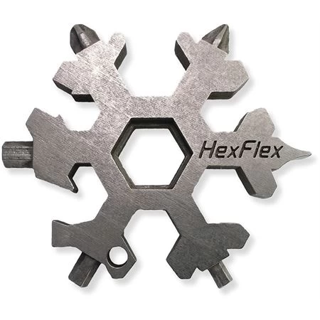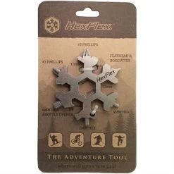 Model – HEXSS23M. Adventure Tool Metric. Construction: Stonewashed finish stainless construction. Overall: 2.5 inch; Other Info: Snowflake shaped unibody design. 15 tools and counting including #2 and #3 Phillips screwdriver, flathead screwdriver/boxcutter, #3, #4, #5 hex drivers, bottle opener, 5mm, 6mm, 7mm, 8mm, 10mm, 11mm, 12mm, 13mm, 14mm wrenches. Hang Packaged