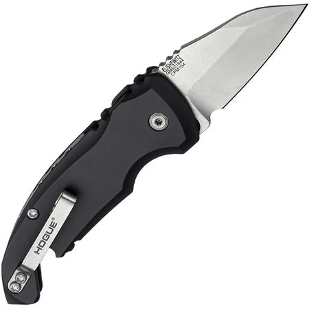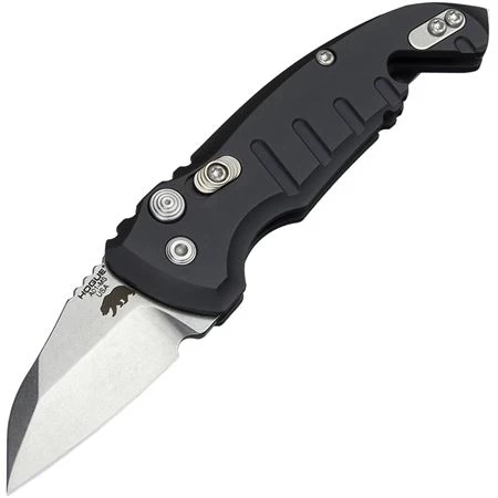 Model/Part Number – HO24140. Hogue Knives Auto A01 Microswitch Button. Automatic opening. 4″ (10.16cm) closed. 2″ (5.08cm) tumbled finish CPM-154 stainless Wharncliffe blade. Black anodized aluminum handle. Bottle opener. Pocket clip. Manual safety. Impact pommel. Boxed. Proudly made here in the USA.