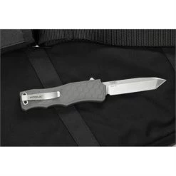 Model/Part Number – HO34042. Hogue Knives Auto Exploit Out-The-Front. Automatic opening. 4.88″ (12.4cm) closed. 3.5″ (8.89cm) tumbled finish CPM S30V stainless tanto blade. Gray anodized aluminum handle. Pocket clip. Ambidextrous trigger deployment and retraction. Boxed. Proudly made here in the USA.