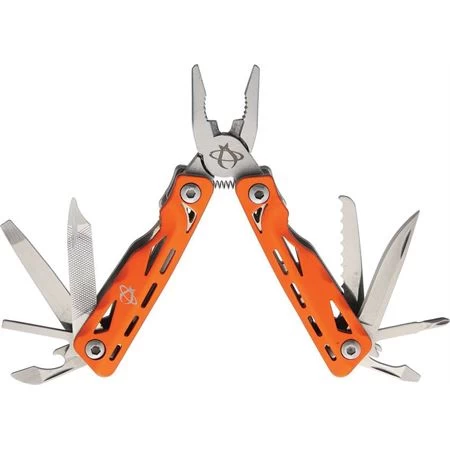 Model – MANTC172O. Multi Tool Orange. Multi Tool. 2.75 inch closed. Orange aluminum handles. Tools include: Bottle opener l Can opener l Small screwdriver l Phillips screwdriver l Small blade l Serrated blade l Screwdriver tip l Pliers. Black nylon pouch. Boxed.