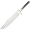Model – MR457. Damascus Bowie Horn. 10.75 inch overall. 6 inch Damascus steel blade. Jigged horn handle. Stainless guard and aluminum pommel. Brown leather belt sheath.