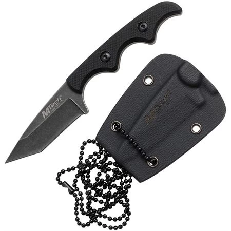 Model – MT673. MTech 673 – Neck Fixed Blade Knife. 5″ overall. 2″ black stonewash finish stainless tanto blade. Black G10 handle. Full tang. black Kydex neck sheath. Made in China.