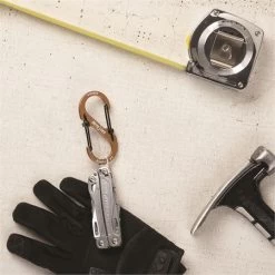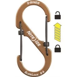 Model – N04706. S-Biner Slidelock #4. Dimensions: 1.6 inch x 3.5 inch x 0.4 inch. Stainless wire gate. Lightweight and strong. Not for climbing. Aluminum construction. Color: Brown. Hang packaged. Made in China