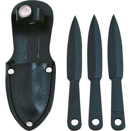 Model – PA3072. Little Arrow Throwing Knives Fixed Blade Knife. Three 4.5 inch overall black finish high carbon steel knives. 2.5 inch double edged blade. Black imitation leather belt sheath holds all three. Made in Pakistan.