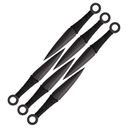 Model – PA3334. 6 Piece Throwing Set Fixed Blade Knife. 6.38 inch overall. 3.25 inch double edge dagger style blade. One piece black coated stainless construction. Black cord wrapped handle. Lanyard hole. Black nylon storage case with velcro closure. Made in Pakistan.