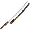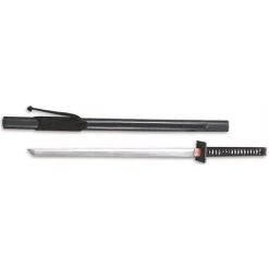 Model – PC1071. Practical Shinobi Ninja Sword. 34.5 inch overall. 22.75 inch carbon steel blade. White imitation rayskin handle with black imitation leather wrap. Forged and differentially tempered blade. Antique black finish iron tsuba and fittings. Specs may vary slightly from piece to piece. Black wood scabbard.