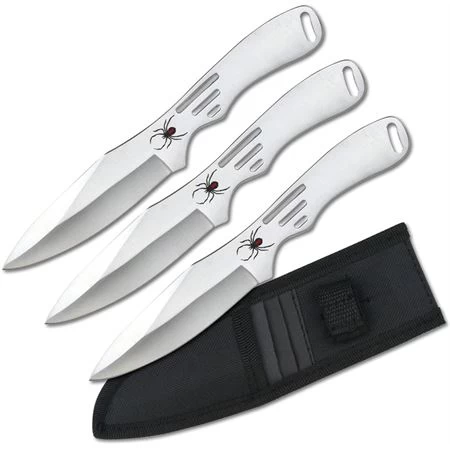 Model/Part Number – M4505. Perfect Point Throwing Knives Throwing Knife Set. 7.75″ (19.69cm) overall. 3.5″ (8.89cm) satin finish stainless blade. One-piece construction. Lanyard hole. Spider blade artwork. Black nylon belt sheath. Boxed. Made in China.