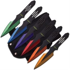 Model/Part Number – M4509. Perfect Point Throwing Knives Throwing Knife Set. 5.5″ (13.97cm) overall. 2.75″ (6.99cm) blade. Black handle. One-piece construction. Set of six (green, blue, purple, red, orange, yellow finish blades). Sheath has leg straps. Black nylon belt sheath. Boxed. Made in China.