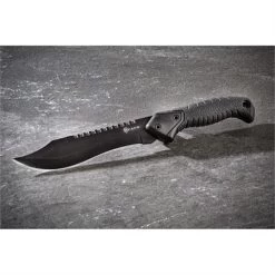 Model – SHF11001. Reaper 11001 – Tac Bowie Clip Point Blade Knife with Black TPR Handle. 13″ overall. 7″ black oxide coated sawback 420 stainless clip point blade. Black TPR handle. Lanyard hole. Black nylon belt sheath. Clam packed. Made in China.