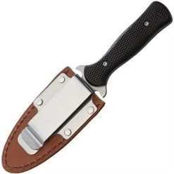 Model – RR1810. Rough Rider 1810 – Small Double Edge Stainless Dagger Blade with Black Checkered Synthetic Handle. 7″ overall. 3.5″ satin finish double edge stainless dagger blade. Black checkered synthetic handle. Full tang. Brown leather belt sheath. Boxed. Made in China.