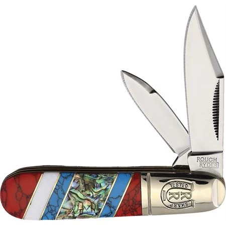 Model/Part Number – RR2403. Rough Rider Knives Barlow. Stoneworx. 3.25″ (8.26cm) closed. Mirror finish stainless clip and pen blades. Nickel silver bolster(s). Red stone, Abalone, Mother of Pearl, green malachite, and turquoise handle. No two pieces are exactly alike. Boxed. Made in China.