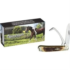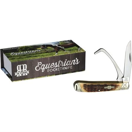 Model – RR1971. Rough Rider Knives 1971 – Equestrian Trapper Amber Bone. 4.13″ closed. Mirror finish stainless clip blade and hoof pick. Amber jigged bone handle. Nickel silver bolster(s). Inlay shield. Boxed. Made in China.
