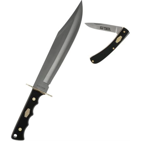 Model/Part Number – SCHP1188054. Schrade OT Bowie Knife & Folder. Old Timer. Satin finish stainless blade. Brown sawcut Delrin handle. Lanyard hole. Inlay shield. Includes: 15.5″ overall bowie with 10″ blade; 3″ folder with clip point blade. Black nylon belt sheath. Clam packed. Made in China.