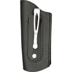Model – SH1000. Sheath 1000 – Large Folding Knife Belt Sheath with Black Leather Construction with Open End. 3.75″ overall. Black leather construction with open end. Metal pocket clip. Will hold medium-large folding knives. Front and back shown. Bulk packed. Made in China.