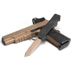 Model/Part Number – SIG36020. SIG Auto Compound OTF FDE. Automatic opening. 5″ (12.7cm) closed. 3.5″ (8.89cm) dark earth PVD coated CPM S30V stainless tanto blade. Black G10 handle. Pocket clip. Mini Piranha texture handle. Ambidextrous trigger deployment and retraction. Boxed. Made in USA.